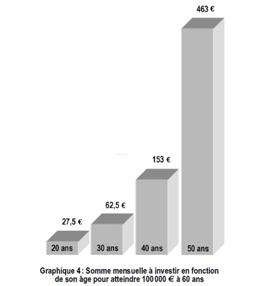 Par ailleurs, pour ceux qui ont des enfants, cette petite histoire doit aussi vous faire prendre conscience de l’importance de mettre en place pour eux des solutions de placement dés leur naissance et, quand il seront en âge de comprendre,  de les éduquer sur le sujet. Regardez le graphique ci-dessous. Celui-ci indique l’âge du premier investissement et la somme qui doit être placée chaque mois à 8 % pour atteindre le capital de 100000 euros à 60 ans. Il apparaît que pour des sommes minimes (27 euros par mois, soit moins d’un euro par jour à l’âge de 20 ans) vous pouvez les aider à assurer leur retraite.
